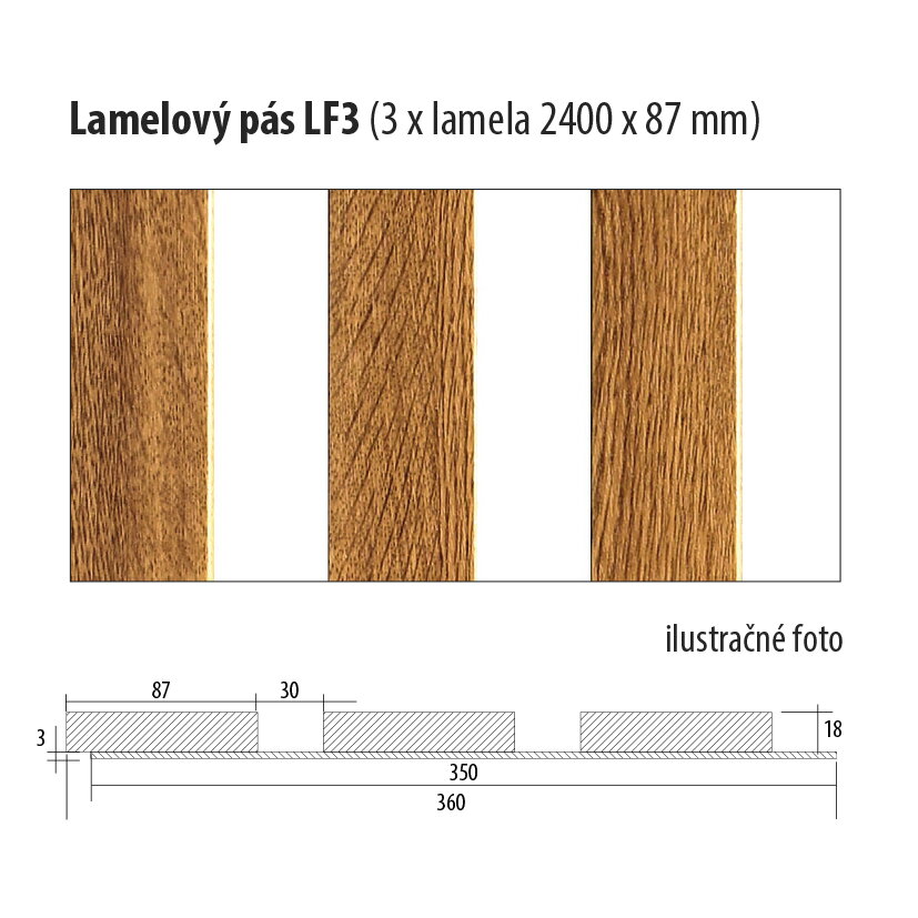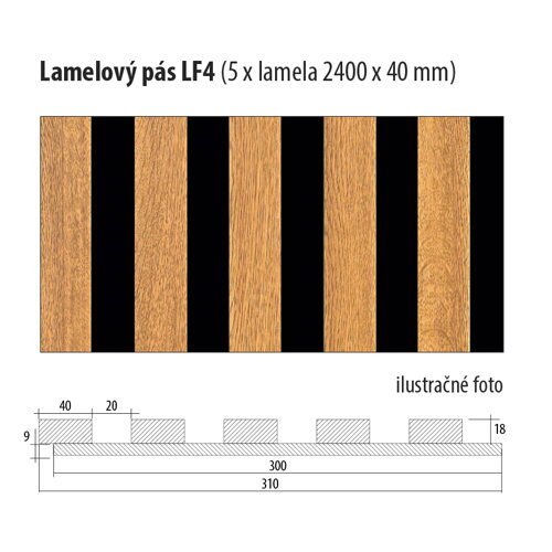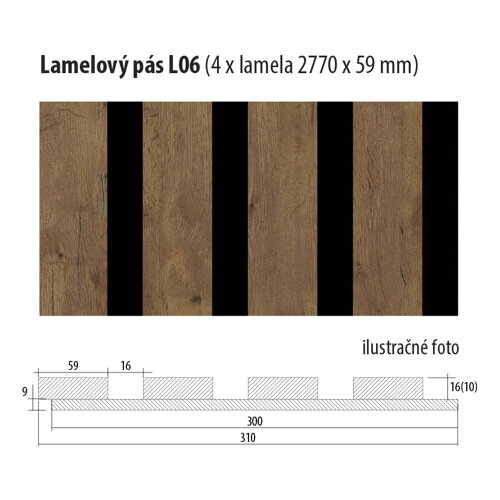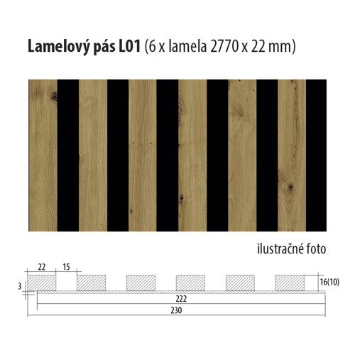 Lamely sú vyrobené z obojstranne lamínovanej dosky s jadrom z čiernej MDF. Pohľadová strana lamely - drevodekor, hrany - surová čierna MDF. Lamely dodávame v šírke 22, 40 a 59mm buď samostatne, alebo na čiernom panely hrúbky 3mm upevnené sponkami - rozmer zostavy je 2770x222mm. Lamely máme v ponuke v hrúbke 16 mm a v hrúbke 10mm ( tri drevodekory)